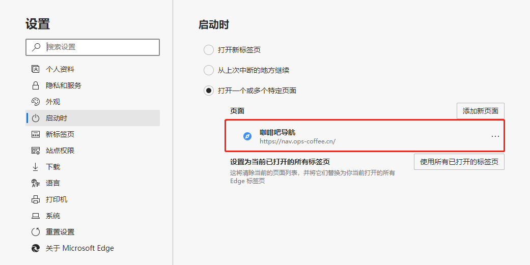 找到启动时设置,选择选择特定网页或一组网页,点击添加新网页,填写网址https://nav.ops-coffee.com,点击添加即可