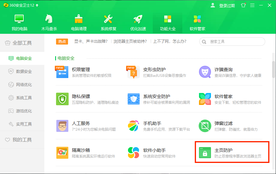 打开360安全卫士,点击顶部功能大全,找到主页防护