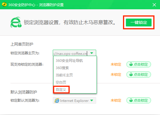 点击主页防护弹出设置框,点击锁定浏览器主页为后边的输入框,选择自定义,然后输入https://nav.ops-coffee.com,然后点击上方一键锁定